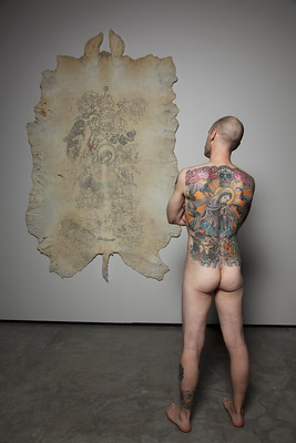Wim Delvoye (1965, Wervik, Belgium; lives and works in Ghent, Belgium) Tattooed human skin. Tattooed pigskin, 240 x 168 cm, Studio Wim Delvoye, Belgium. Photo Credit: MONA/Remi Chauvin. Image Courtesy MONA Museum of Old and New Art, Hobart, Tasmania, Australia.