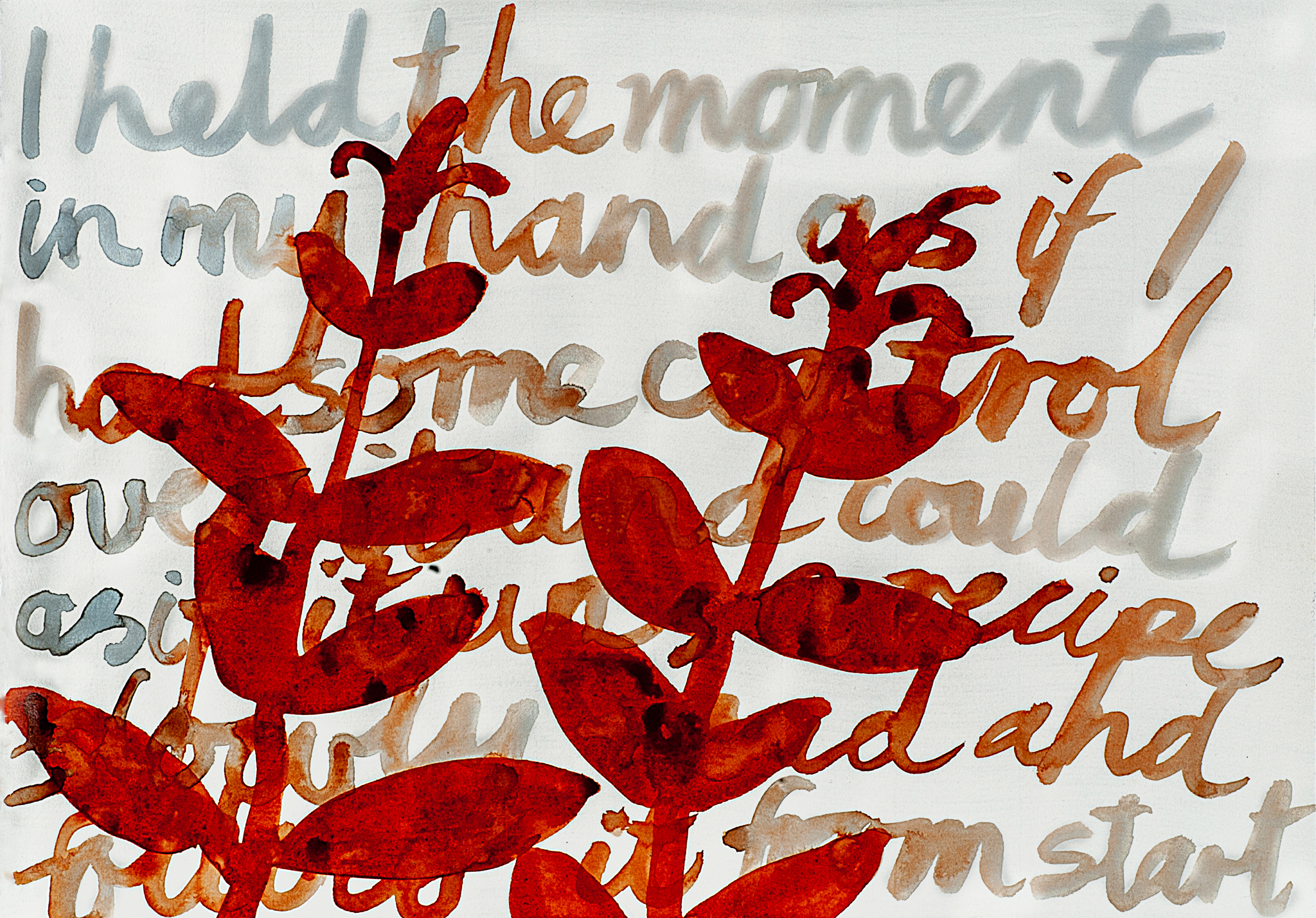 For Pages from a 21st Century Herbal I looked at images of herbs in various books and painted them in sanguine (blood-red) ink on fine paper. While the ink was still wet I wrote in blue ink directly from my thoughts, a kind of automatic writing, over the plant. The words are not all legible and suggest hidden wisdom and rich silences.