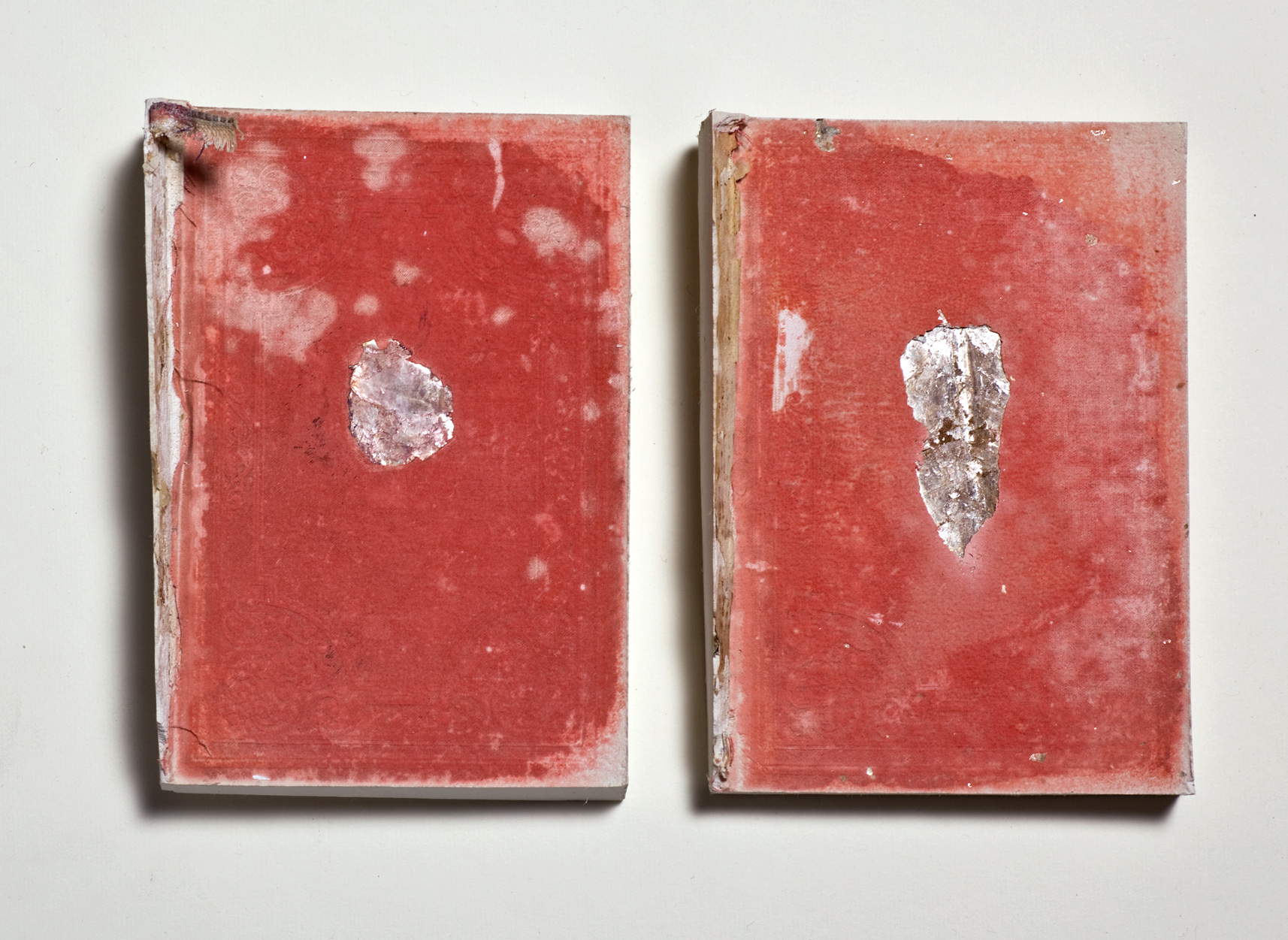 I started making books in plaster as an experiment quite a while ago. Then I found a twelve volume Collected Works of Goethe/ Goethe’s Samtliche Werke (published in Stuttgart in 1885) brought out of Germany by my father’s parents when escaping. The mica is found in the hills of Adelaide.